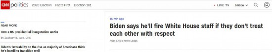 报道提到,拜登称,他希望他的职员能以礼貌的方式对待彼此,他说,这一点“在过去四年里已经遗失了很多。”