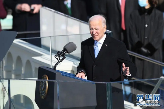 接下来,就是拜登的高光时刻。在重兵把守的国会,他宣誓就职,发表了约20分钟的演讲。