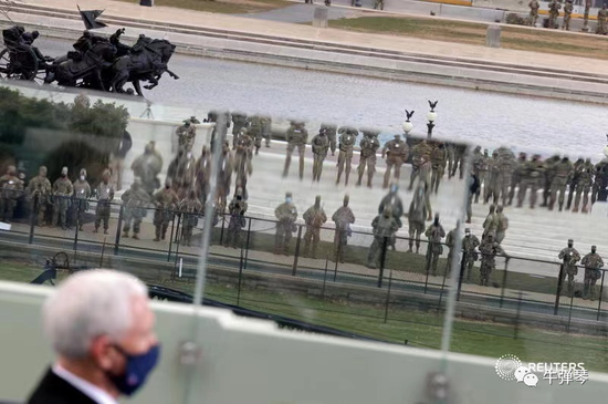 但在2000嘉宾旁边,是两万多美国大兵。派驻到华盛顿维稳的美国士兵,比在伊拉克、叙利亚、阿富汗的美国驻军总和还多。