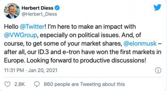赫伯特·迪斯的首条动态写到:“你好@Twitter!我将在这里和大众集团一起做出影响,尤其是在政治问题方面。另外,@elonmusk,我们当然还要夺走你们的一部分市场份额。我们的ID.3和e-tron已经赢得了首批欧洲市场。期待着和你们进行富有成效的讨论!”