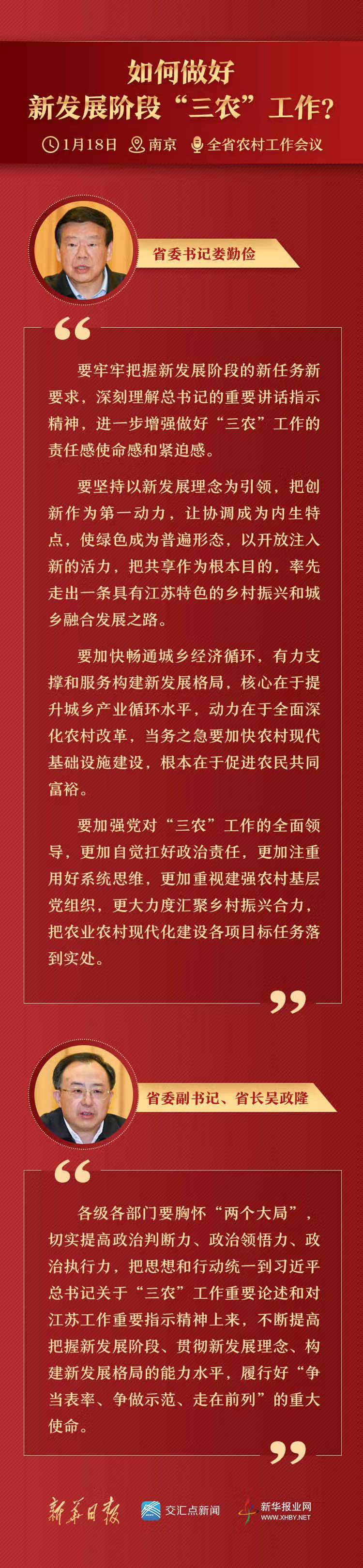 各级各部门要胸怀“两个大局”,切实提高政治判断力、政治领悟力、政治执行力,把思想和行动统一到习近平总书记关于“三农”工作重要论述和对江苏工作重要指示精神上来,不断提高把握新发展阶段、贯彻新发展理念、构建新发展格局的能力水平,履行好“争当表率、争做示范、走在前列”的重大使命。要全力推动乡村振兴,着力抓好关键重点工作,深化农业供给侧结构性改革,压紧压实“米袋子”“菜篮子”负责制,加强农村基础设施和公共服务设施建设,抓好耕地和种子“两个要害”,强化农村生态文明建设,持续抓好长江“十年禁渔”;要围绕重点领域深化改革、完善机制,增强农业农村发展的动力活力,促进共同富裕;要牢牢守住安全发展底线,关心困难群众生产生活,持之以恒抓好安全生产和农村疫情防控工作,努力实现农业高质高效、乡村宜居宜业、农民富裕富足,奋力谱写“强富美高”新江苏建设现代化新篇章。