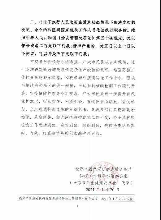 荔枝新闻讯 据松原发布官方微信消息,松原市新型冠状病毒肺炎疫情防控工作领导小组办公室20日发布《关于对违反全员核酸检测行为处罚的通告》(以下简称通告)。通告明确,对不配合调查、采样和检验的,将依法追究相关责任。