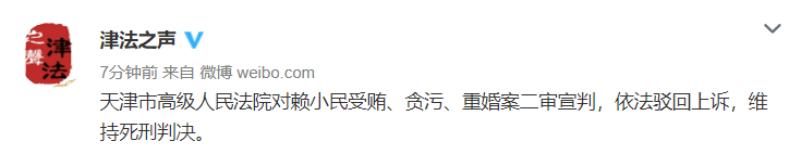 天津市高级人民法院对赖小民受贿、贪污、重婚案二审宣判,依法驳回上诉,维持死刑判决。