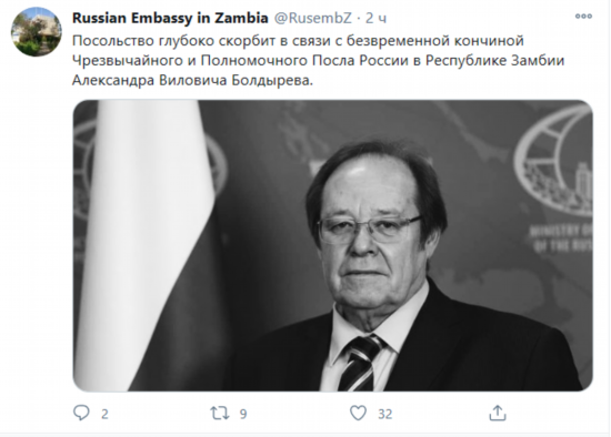据俄新社当地时间21日援引俄罗斯驻赞比亚大使馆社交账号消息,俄罗斯驻赞比亚大使博尔德列夫在任上去世。