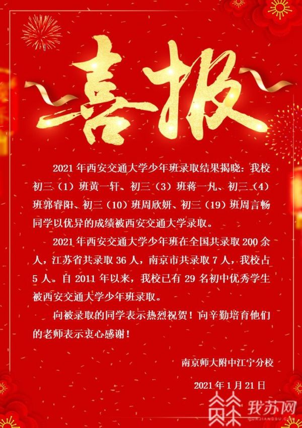 日前,西安交通大学2021年"少年班"公布录取结果,全国共录取约200人,江苏省录取36人,南京市录取7人,今天记者了解到,其中5人来自南师附中江宁分校。