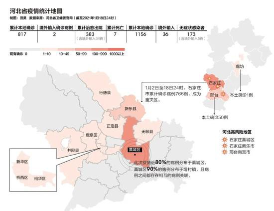 截至2021年1月18日24时,河北省现有本地确诊病例800例,无症状感染者168例,石家庄市累计确诊病例766例,成为重灾区。河北第1例确诊病例不是“零号病人”。河北疾控中心应急办主任师鉴表示,初步估计河北零号病例早于去年12月15日。病毒已经在村庄间隐性传播了一段时期。