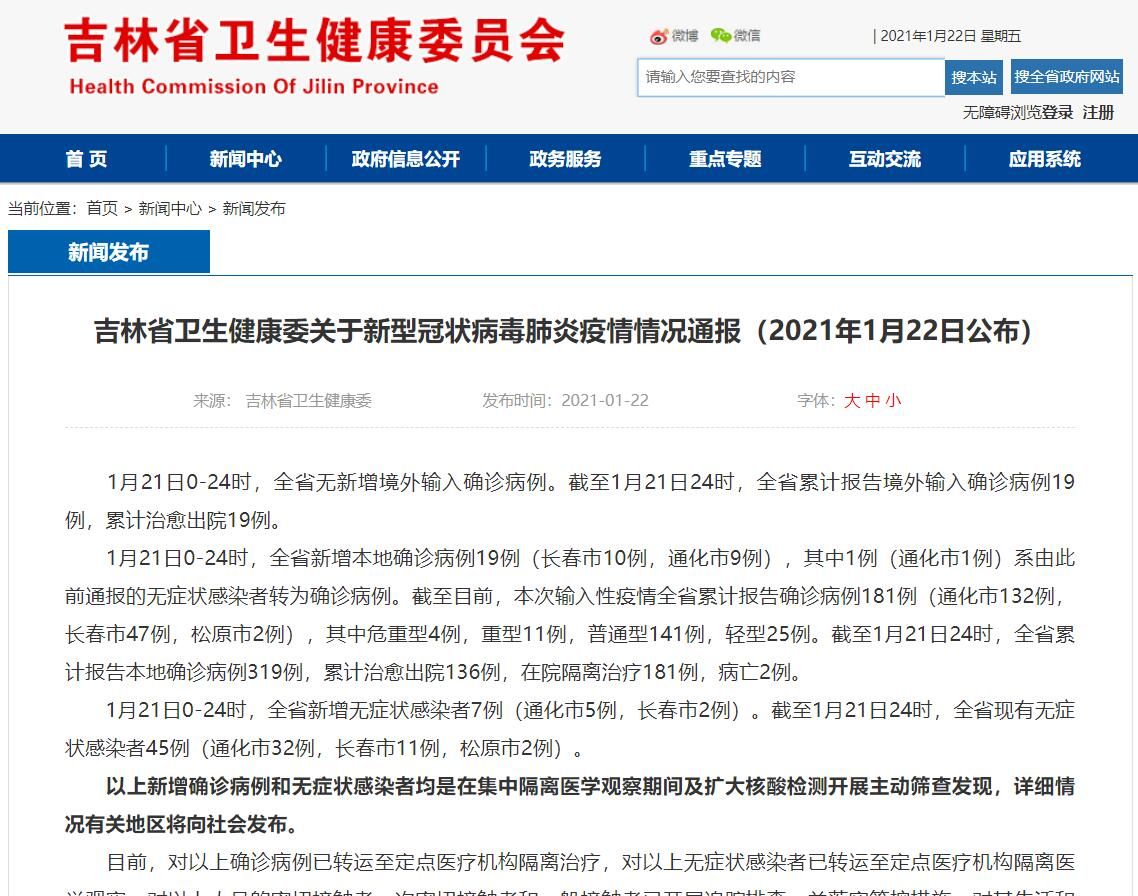 1月21日0-24时,全省新增本地确诊病例19例(长春市10例,通化市9例),其中1例(通化市1例)系由此前通报的无症状感染者转为确诊病例。截至目前,本次输入性疫情全省累计报告确诊病例181例(通化市132例,长春市47例,松原市2例),其中危重型4例,重型11例,普通型141例,轻型25例。截至1月21日24时,全省累计报告本地确诊病例319例,累计治愈出院136例,在院隔离治疗181例,病亡2例。