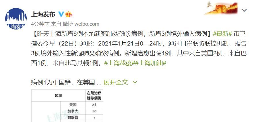 荔枝新闻讯 上海市卫健委今早(22日)通报:2021年1月21日0—24时,通过口岸联防联控机制,报告3例境外输入性新冠肺炎确诊病例。新增治愈出院4例,其中来自美国2例,来自巴西1例,来自北马其顿1例。