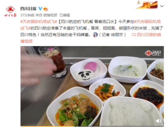 今天参加天府国际机场试飞的四川航空准备了丰盛的飞机餐,冒菜、担担面、熊猫形状的米饭,充满了四川特色!当然还有压轴的老干妈辣酱。