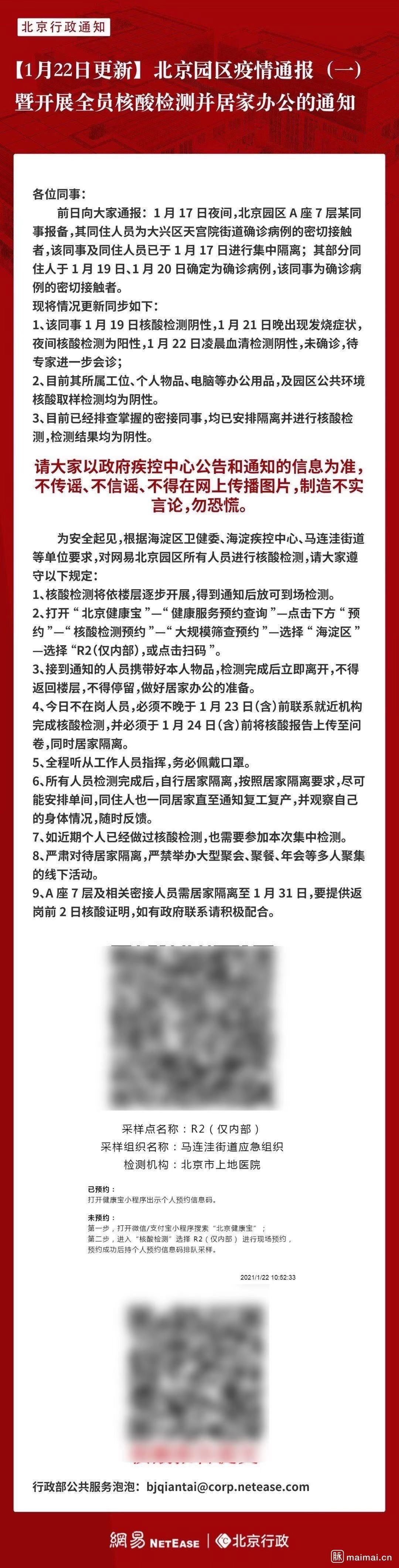 荔枝新闻讯 1月22日,网传网易北京一员工核酸检测阳性。网易今日中午发布内部全员邮件,称1月17日夜间,北京园区A座7层某同事报备,其同住人员为大兴区天宫院街道确诊病例的密切接触者。该同事及同住人员已于1月17日进行集中隔离;其部分同住人于1月19日、1月20日确定为确诊病例,该同事为确诊病例的密切接触者。