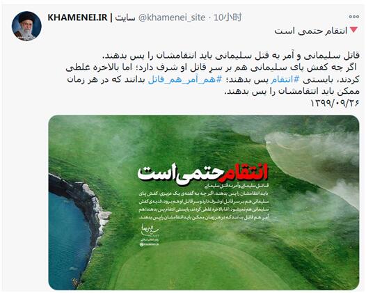 哈梅内伊的推文原文是波斯语,根据路透社的翻译,他在推文中写道,“那些下令谋杀苏莱曼尼将军的人和凶手都应该受到惩罚。这次报复一定会在正确的时间发生。”↓