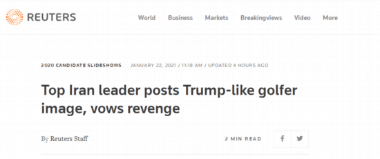 【环球网报道 记者 张晓雅】卸任美国总统后,特朗普还被“惦记”着。综合美国《国会山报》及英国路透社报道,伊朗最高领袖哈梅内伊当地时间21日晚在推特上发布了一张神似美国前总统特朗普正在打高尔夫的漫画,推文核心大意是为去年1月遭美国无人机袭击身亡的伊朗革命卫队高级将领卡苏莱曼尼“复仇”。