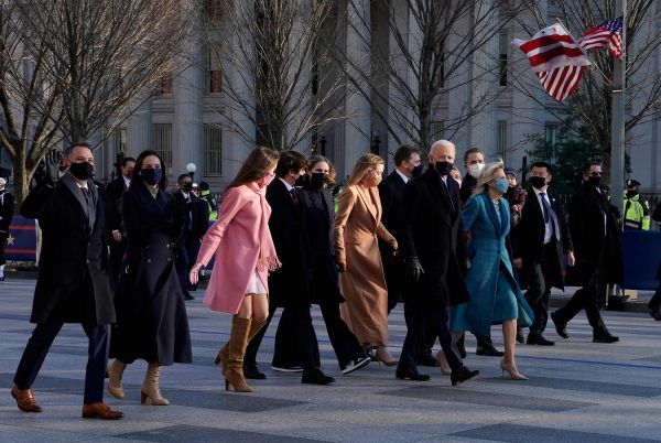 下午晚些时候前往白宫的游行队列有着以往的盛大场面和军人气质,但不像以往那样有夹道观看的观众。拜登以喜欢触摸交流著称,但在他和家人前往新家最后一段路程中,除了妻子吉尔的手,他几乎没有触碰任何东西。