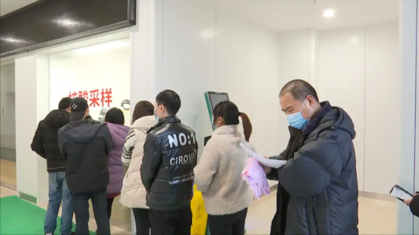 随着春节临近,返乡人群增多,做核酸检测的人数日益上升。在二院北部院区采样点,记者见到不少待检测人员在排队等候。