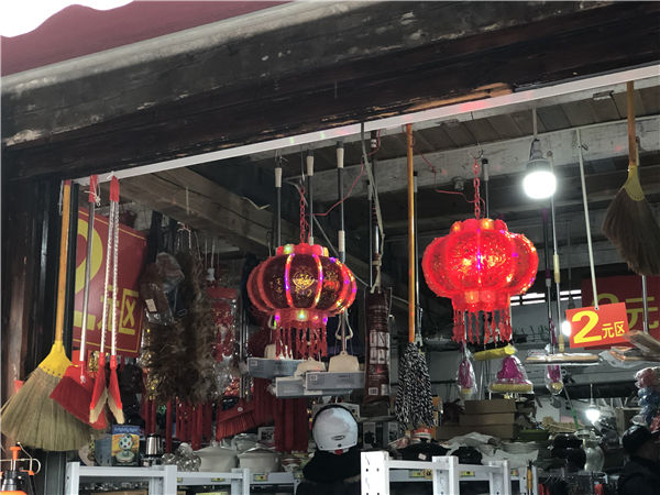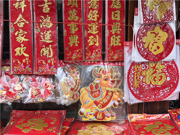 走进南门坛上,不少店铺门口都挂着灯笼和楹联,到处是一片红红火火的景象。前来选购过节用的老黄历、春联的市民络绎不绝。市民姜鹤华说:“马上过年了,家里面搞得喜庆一点,比如说贴贴春联,福字,牛年牛气冲天。”市民曹文霞说:“南门坛上是常熟比较闹热的地方,东西比较齐全,常熟人置办年货都要到这儿来,春节的氛围非常浓。”
