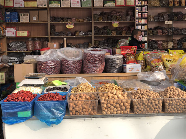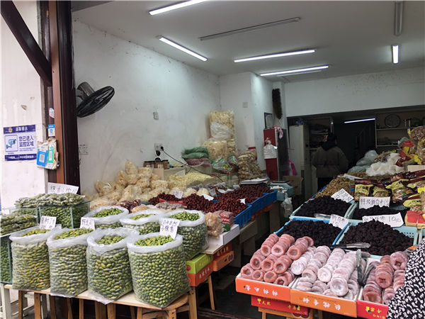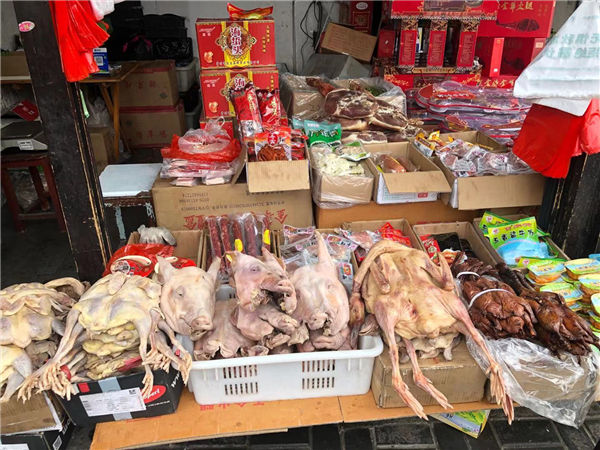 放眼南门坛上,年货应有尽有。店铺门口挂满的腊肠、火腿是过节餐桌上必不可少的美味。据店主张耀良介绍,这两天,火腿的销量非常火爆。他们已经提前备足了货,确保节前货品充足。“主要火腿、风腿,传统的咸猪头,咸鸡,风鹅……像这些都是老百姓春节饭桌上得必需品,每年每家人家必须都要用的。”张耀良说。