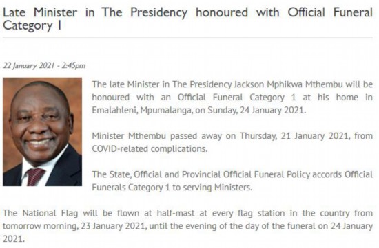 南非总统府部长杰克逊·姆坦布因新冠肺炎的并发症于1月21日去世。1月24日南非政府将在杰克逊·姆坦布的家乡姆普马兰加省为其举行一级国葬。当天南非全国将降半旗。
