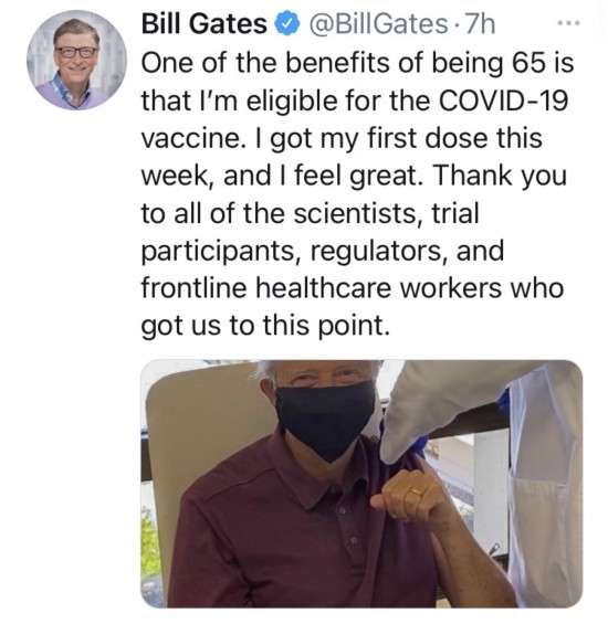 在22日的推文中,比尔·盖茨宣布了自己接种第一剂新冠疫苗的消息,他说自己“感觉很棒”。“作为65岁(老人)的好处之一,就是拥有接种新冠疫苗的资格。我本周接种了第一剂疫苗,我感觉很棒。”接着,他感谢了所有参与疫苗工作的科学家、试验参与者以及前线医护工作者。