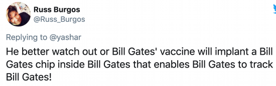 “他(比尔·盖茨)最好小心点,不然比尔·盖茨的疫苗会在比尔·盖茨体内植入一个芯片,这样比尔·盖茨就能追踪比尔·盖茨了!”