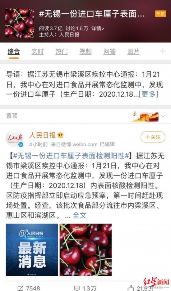 车厘子表面核酸检测阳性 阅读量超3亿