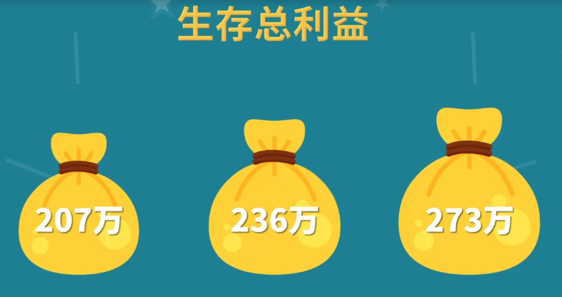 此外,第5个保单周年日开始至终身,合同给付的生存金32000元可选择自动转入终身保证最低利率3%的金管家账户,按照低( 保证利率3%)、中(演示利率4.5%)、高(演示利率6%)三档利率分别测算,张先生累计缴纳的100万元,在孩子20周岁的时候,生存总利益约为150万、159万和168万,可以作为教育金;30周岁的时候,生存总利益约为207万、236万和273万,可以作为创业储备金。