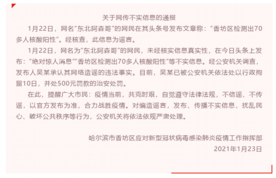 1月22日,网名“东北阿森哥”的网民在网络发布文章称:“香坊区检测出70多人核酸阳性”。经核查,此信息为谣言。经公安机关调查,发布人吴某承认其网络造谣的违法事实。目前,吴某已被公安机关依法处以行政拘留10日,并处500元罚款的治安处罚。