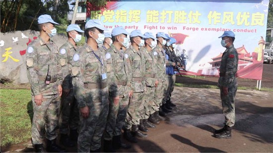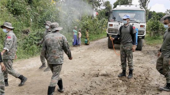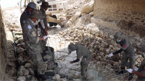 维和官兵在施工期间严格落实疫情防控和安全防范措施,全程佩戴口罩,适时组织洗消,协调护卫力量全时段加强警戒防卫。