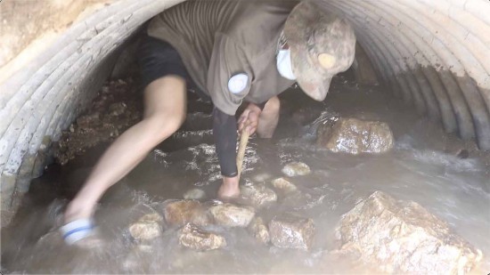 由于涵管被淤泥杂物堵塞严重,空间狭小,官兵们只能蹲在涵管里轮流进行人工清除。在路基塌陷地段,他们将受损涵管重新对接,利用制式网箱装填砂石垒砌护坡挡墙,用铁丝笼装填石块对空隙进行回填,最后对路面进行平整压实。
