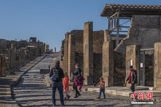 当地时间1月18日,意大利坎帕尼亚大区庞贝古城,由于被定义为处于新冠疫情低风险地区,庞贝古城重新对游客开放。开放第一天,游客们佩戴口罩在古城内参观。图片来源:视觉中国