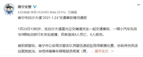 荔枝新闻讯 据南宁交警通报,1月24日13时许,在白沙大道星光立交辅道发生一起交通事故,一辆小汽车先后与9辆电动自行车发生碰撞,目前造成4人死亡,6人受伤。