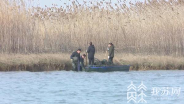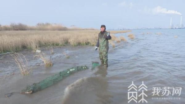 昨天早上九点,迎着凛冽的寒风,记者跟随润州区农业农村局渔政大队的清网人员从江海之门出发,沿着长江北岸而上。冬日的长江,芦花随风飘荡,波光粼粼,宁静祥和。随着执法艇进入焦山南出口水域,可以看到随着长江枯水期的到来,岸线水位下降,不少地笼渔网露出了水面,很煞风景。