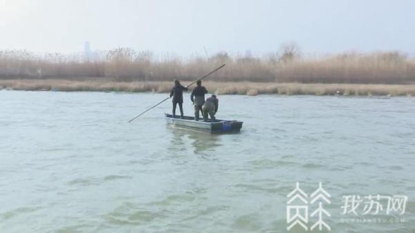 渔政大队工作人员与润州区长江护渔队员驾着小舟在水中开始了清理工作,不一会就清理出整整一小船。