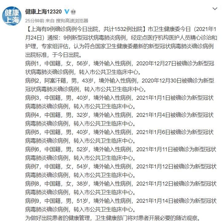 荔枝新闻讯 据@健康上海12320 微博消息,上海市卫生健康委今日(2021年1月24日)通报:9例新型冠状病毒肺炎病例,经定点医疗机构医护人员精心诊治和护理,专家组评估,认为符合国家卫生健康委最新的新型冠状病毒肺炎确诊病例出院标准,于今日出院。