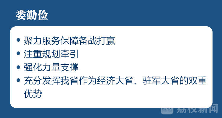娄勤俭强调,要聚力服务保障备战打赢,全面贯彻总体国家安全观,增强忧患意识,树牢底线思维,更高标准统筹发展和安全两件大事,把国防动员工作抓得紧而又紧、实而又实。要注重规划牵引,增强系统观念,加强军地统筹、跨域统筹、“战”“建”统筹,加快提升国防动员建设质量效益。要强化力量支撑,持续深化民兵调整改革,认真落实“一年两次征兵”任务,为强军事业输送更多高素质人才。要充分发挥我省作为经济大省、驻军大省的双重优势,找准国家军事战略与现代产业体系建设、基础设施建设、区域协调发展的结合点,推动经济实力有效转化为军事实力。