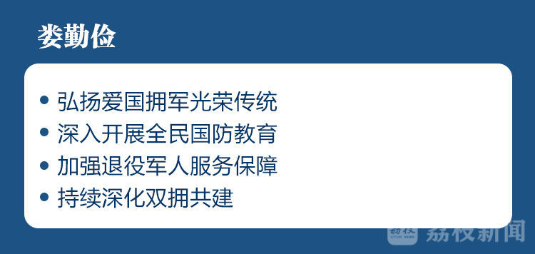 娄勤俭指出,要弘扬爱国拥军光荣传统,不断巩固发展军政军民团结良好局面。深入开展全民国防教育,以庆祝建党100周年为契机,深入开展党史军史、新中国史、改革开放史、社会主义发展史教育,凝聚强国兴军磅礴力量。加强退役军人服务保障,以强烈的政治意识做好退役军人教育引领、就业安置、权益维护等工作,以深厚的为民感情加强对困难退役军人的关怀帮扶。持续深化双拥共建,全力支持驻苏部队深化改革,当好人民军队的坚强后盾。