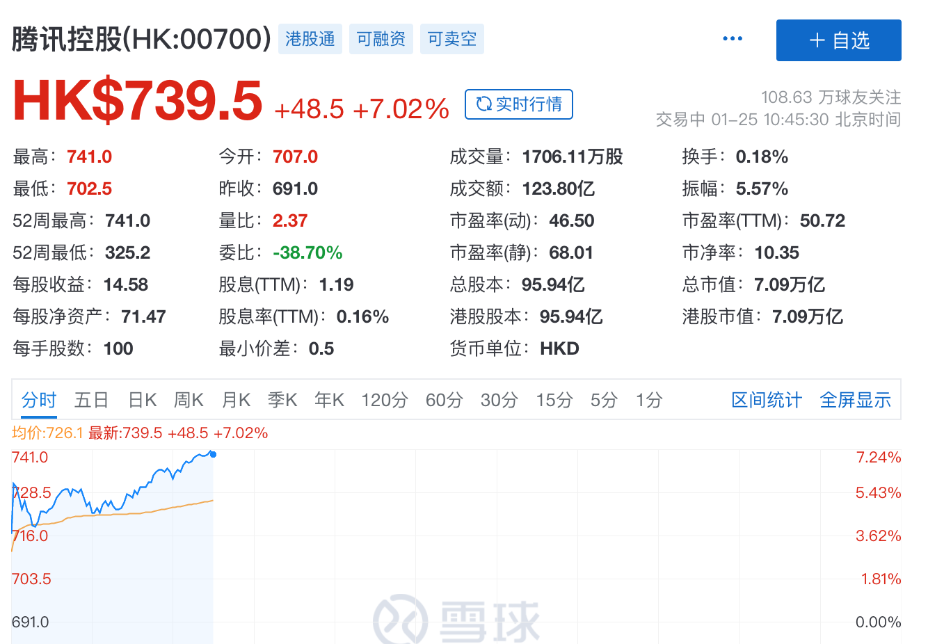 1月25日,腾讯控股以707港元开盘,较上一交易日收盘价高开2%,站稳700港元。