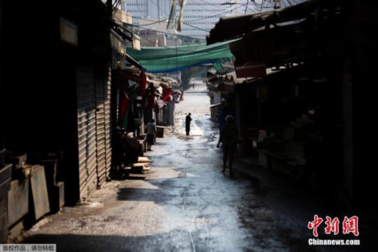 图为以色列特拉维夫,一名工作人员清理封闭的市场。