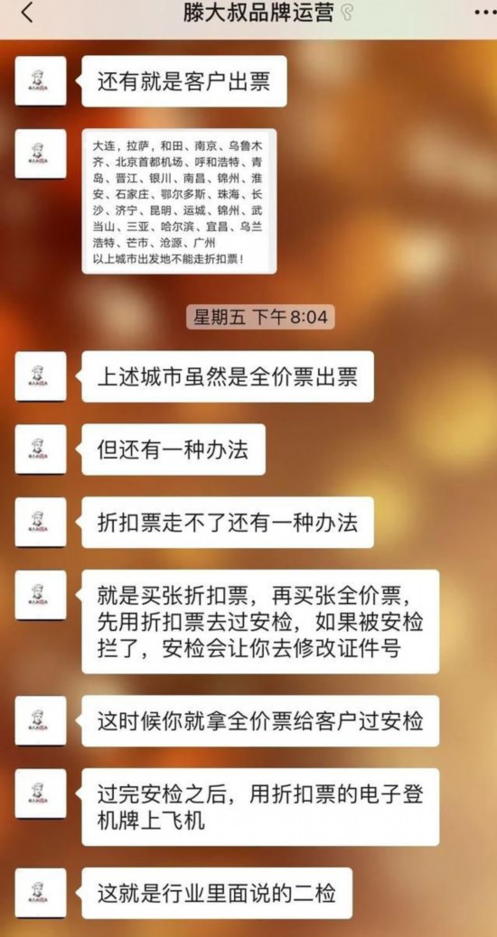 “滕大叔品牌运营”同时向记者列举了订票的一些所谓注意事项和圈内技巧。他称,身份证只能订国航、东航、上航、南航、深航5家航司的机票;用护照订机票时,客户姓名中有多音字时,故意输错的话,安检就容易通过,如任重(zhong)是“限高”人员,订票时可以故意输入任重(chong);折扣票不能过安检时可以换个安检口,或“偷梁换柱”:“买张折扣票,再买张全价票,过安检先用折扣票试,如果被安检拦住,会让修改证件号,这时候拿全价票让客户过安检。过完安检后,再用折扣票的电子登机牌登机,也就是圈内所称的‘二检’。”