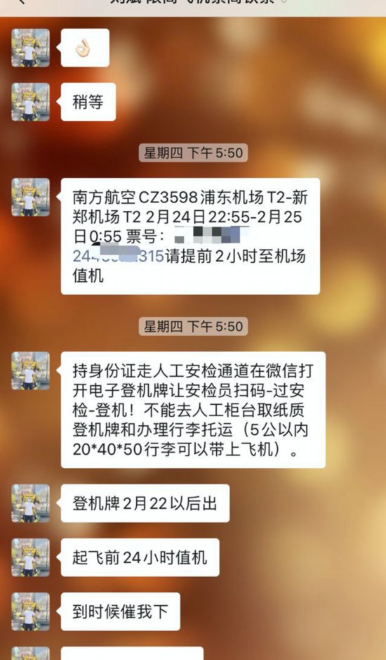 澎湃新闻记者将前述一位“限高”人员的身份信息发给“刘斌”,并随机选择2月24日中国南方航空上海浦东至郑州新郑机场的一趟折扣机票。支付230元票价和300元手续费后,“刘斌”不到10分钟即为记者出票,发来包含电子客票号在内的航班信息。