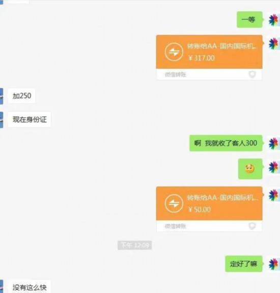 “原本赚你100元,现在只赚你50元,找上家订的票。”“彩乐假期”给记者出示了一张和他的订票“上家”联系订票的微信聊天截图。图中,他将记者提供给他的“限高”信息发给对方,并转账317元,对方告诉他,身份证出高铁票成本涨了,“彩乐假期”又转给对方50元。