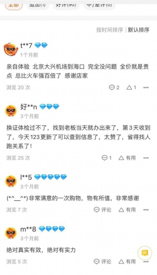 “巍巍车管家订票”就是其一。他将自己为“限高”人员提供订票出行的服务搬上了淘宝。他经营的两家网店的封面图,均系用线条勾勒出的轿车外型,再加上“巍巍车管家”几个字,未挂商品或服务。而店铺下方上百条的用户好评中,不少用户评论商家出票真实可靠。“两年没坐过飞机了,开始还不信,来回往返都成功了,现在彻底信了;亲自体验,北京大兴机场到海口,完全没问题。”