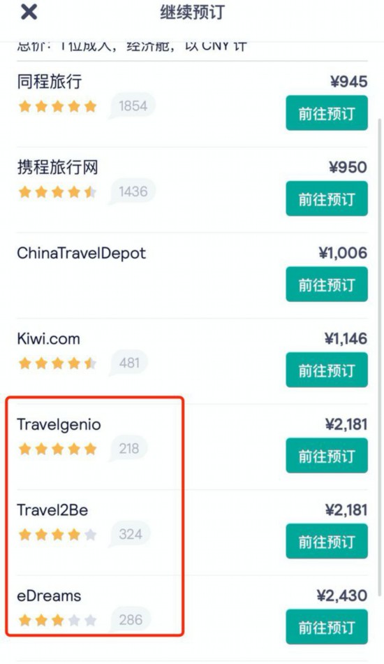 圈内人一般在机票搜索引擎“iGOla骑鹅旅行”或机票比价搜索引擎“Skyscanner天巡”上跳转到“Travelgenio、eDreams、Travel2be”等境外旅游产品服务商上订票。