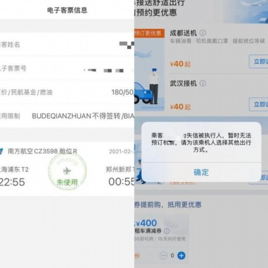 蹊跷的是,将前述“限高”人员信息输入中国南方航空官网机票预订系统,则显示“生成订单失败”;同样,在一第三方订票软件上订票,也显示“旅客被限制高消费,有问题联系法院,无法预订成功。”