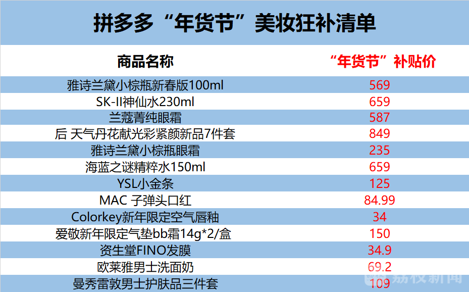 ▲拼多多年货节发布美妆补贴清单。其中,SK-II神仙水230ml百亿补贴后仅售659元,雅诗兰黛小棕瓶新春版100mL到手价只要569元。