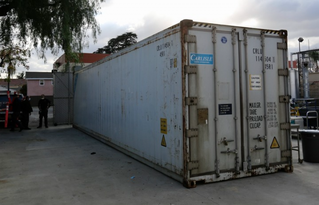 这是1月22日在美国加利福尼亚州蒙特贝洛市比佛利医院拍摄的停放病人尸体的集装箱。新华社发