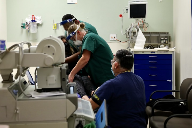 1月22日,在美国加利福尼亚州蒙特贝洛市比佛利医院,医护人员在“新冠病区”的重症监护室忙碌。新华社发