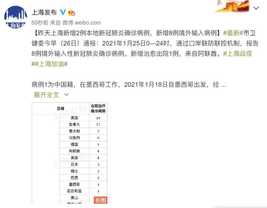 荔枝新闻讯 上海市卫健委今早(26日)通报:2021年1月25日0—24时,通过口岸联防联控机制,报告8例境外输入性新冠肺炎确诊病例。新增治愈出院1例,来自阿联酋。