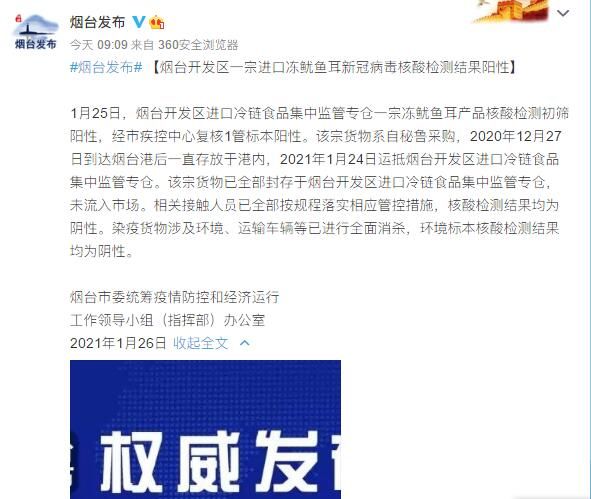 荔枝新闻讯 据烟台市人民政府新闻办公室官方微博26日消息,1月25日,烟台开发区进口冷链食品集中监管专仓一宗冻鱿鱼耳产品核酸检测初筛阳性,经市疾控中心复核1管标本阳性。