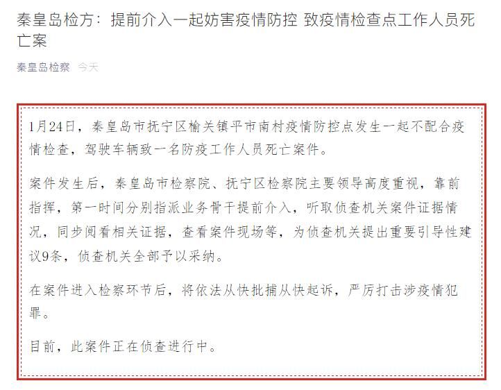 荔枝新闻讯 据河北省秦皇岛市人民检察院微信公众号“秦皇岛检察”消息,1月24日,秦皇岛市抚宁区榆关镇平市南村疫情防控点发生一起不配合疫情检查,驾驶车辆致一名防疫工作人员死亡案件。