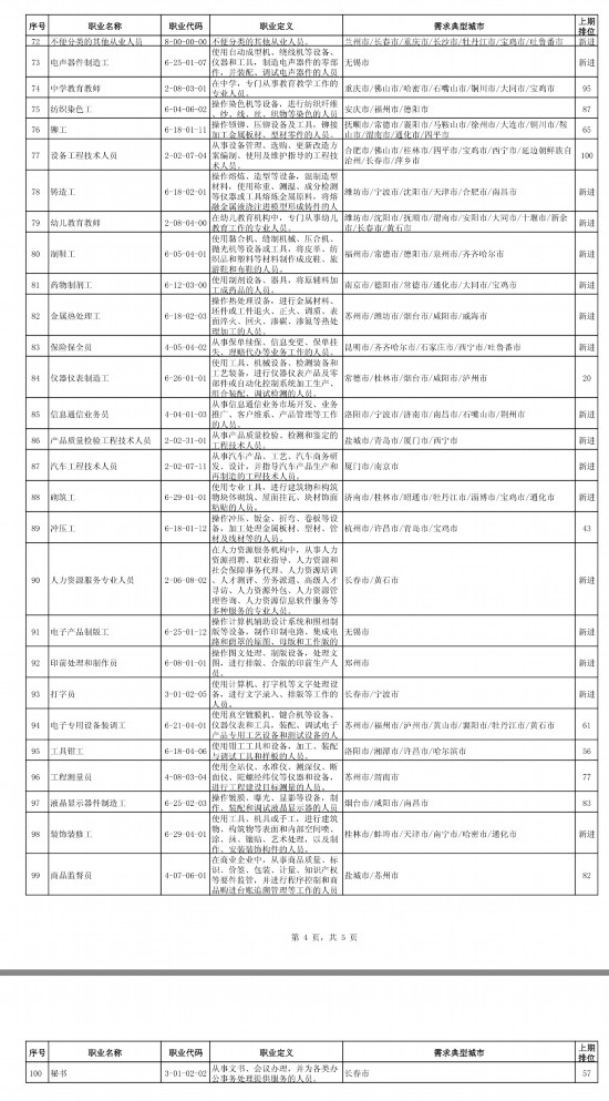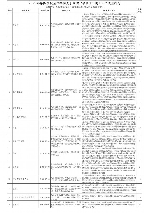 1月26日,人社部发布2020年第四季度全国招聘大于求职“最缺工”的100个职业排行。看看有没有你感兴趣的工作。